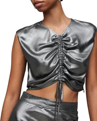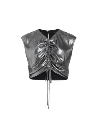 - Ruched self-tie drawstrings at front