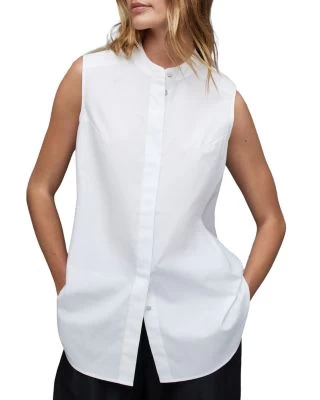 - Shirt: collarless, sleeveless, concealed front button closure, exposed back button closure, rounded hem