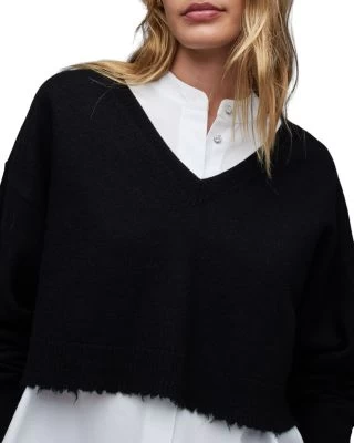 - Sweater: V-neck, long sleeves, cropped silhouette