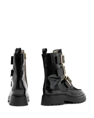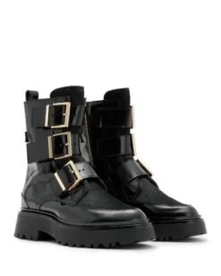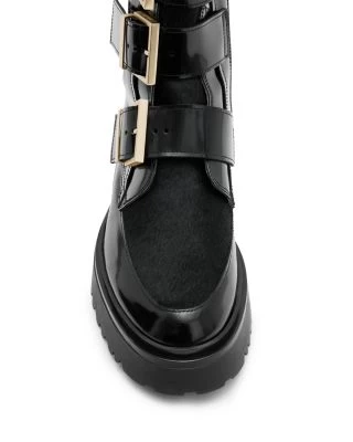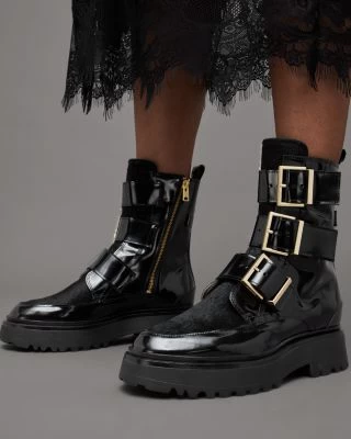 - Three buckled straps and calf hair on upper, pull tab at back